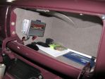 Chuck asked if I would post this, AM radio stations are nearly obsolete so most factory radios fill the dash space only. Many guys will hang a late model FM/CD unit under the dash, hide it in the glove box or maybe stick one under the seat. Well I came across another option that cost less than $100 including the speakers, will play your favorite tunes, will receive FM stations and the head unit is smaller than a flip top pack of smokes. In my case the head unit is mounted to the side of the glove box, no CD but songs are loaded onto an SD card and will hold 400+ songs, the control panel is 1" square. Not a high tech receiver but does the trick when space is limited.