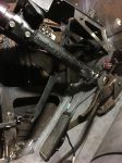 One of the most critical parts of the build as far as I'm concerned brake , gas, steering column and seating position. If it ain't comfortable to drive or awkward to reach the pedals it takes the fun out of driving it. First is the brake pedal, most cars it's about 7"-8" off the floor and 24" from rest the the steering wheel. The brake has to have sufficient travel for full stroke. Then the steering column is centered over the seat. Where the steering goes through the firewall has to clear the engine. Usually the pedal and column want to occupy the same area too. So with much head scratching, trial, error and a few mock ups. Drill some holes and locate the booster. Build under dash bar to mount column. Cut off brake pedal cause it hitting steering column. Throw away factory pedal booster mount bracket cause it ain't working. Draw up new one in CAD. Cut, tack, position, better. Cut and bend 2nd brake pedal to go around column. Ok. Cut hole in floor a little bigger to move column slightly, Be prepared to make another firewall repair. sigh. Steering shaft can't get between exhaust and shock mount. Cut off new shock mount. Throw away. Mock up steering. Will work now. Make new shock mounts. Cool, they look better than the first ones. Modify gas pedal so it will sit properly. Position as far to the right as possible, at rest slightly lower than the brake pedal. Make mount. Mock up seat, climb in. Not time for vroom, vroom noises yet. Check for comfort, steering wheel, centered, dash visable? check. Brake pedal, easy reach, could come over to the right about and inch. No problem do later. Gas pedal looks good. Make up lower column mount. 2 pieces, piece 1 round flange to be welded on column. Piece 2, mating flange to first flange, short length of tube and small hole in end for the shaft to pass through. Second piece will be welded to the floor later. Cut out all the previous patches in the firewall and make one big repair. Much better. Make up shifter bracket to be welded to the floor.