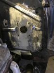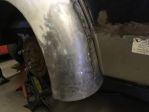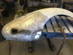 The rear fenders need to be an inch wider for tires clearance. After search for 20 plus years for a RR fender I found this, I knew it wasn't great but better than anything I had so far. It had some previous rust repairs done and filled with lead. Fender must have weighted 30 pounds. I sanded all the primer off and got the torch out to melt it all out. I want to redo the patch in the back. It's got a bad twist in it too. My plan is to build an extended flange on the body then cut off the original and weld the two together. I plan to weld the rear fenders on in the end because I like the molded look better and there's no way I'm ever going to make the fitment nice enough to bolt it together. I got a fairly good start on building the flange over the last 2 days.