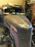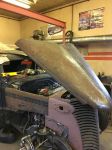 I always hated the original hood design on these cars. They were split in the middle and the each half of the hood and side panel were riveted together. I disliked it so much that years ago I separated the sides and hood, sold off the center strip and welded the hood together without a plan of how to make it work later. My only regret was I should have done a better job of welding the hood. I now have some wrinkles to work out. I always liked the tilt forward design, so with cardboard and scissors in hand I made some strips and played with the pivot points till I got to where I figured it would work. Transferred the ideas to metal and assembled. A bit of tweaking and it seems to work. It's not finished yet, I still have some finessing and gusseting, latches etc to do but I am pleased with the result so far. The coolest part is that it's self balancing. The hood will stay about 3/4 way open all by it self, no prop rod, no binding of the hinges. I will make a prop rod to hold up when open though.