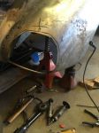 Using all the knowledge I learned from Pugsy's one day learn to pound sheet metal course it was time to rebuild the RR fender. This ugly mess had to go. Modifications were required to blend where the fender meets the body as it was just kinda hanging in midair.