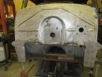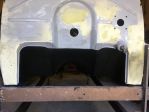 Firewall ready for primer. Cut out the lap joint all the the way around the outside edge and butt welded it back together. Welded up all the holes. Cut out and replaced all the metal in the lower legs.