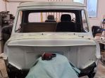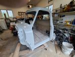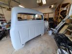 And into epoxy primer. Learning how to spray primer. Figured out that 2 thin coats sprayed 15-20 min. apart are better then one thicker coat. Getting better but still some runs. Now I really see where the dents and dings are. Got some body work ahead of me for sure. Will work on that but may leave some of it for later. I want to get the cab on so I can start moving forward on some other work.