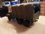 Thought I would share one more truck with you guys and gals. This one is very special to me. It was the first of the models that you have seen. I think I started showing the last one first and so now the first one last, go figure. This one is a bit of a departure from what I normally do. I made it out of pine and painted it. I would normally avoid soft woods as I prefer hardwoods to work with. It was painted with modeling paint. All in the same scale so it is about 15" long. The canvas cover was a piece of fabric that my wife sewed up for me. It is supported with old wire clothes hanger. Inside is all detailed as well but hard to take pictures of. After painting I took some alum. foil and glued that on the mirrors to make them look a bit more real. It is very special to me as I made this for my oldest son. It was given to him as a present when he completed his basic training in the military. It now has a prominent spot in his living room on top of the TV stand. He knew I was making it but thought I was doing it as a challenge to myself and it would stay with me. If you look closely at the last picture looking into the back of the truck you will see a bit of the racking that sits on top of the box sides. In real life you can take the cover off and load the truck full of stuff and then the cover goes back on. You can also drive it without the cover. Colouring is off in the first picture as these were taken with a phone camera so not as good a quality.