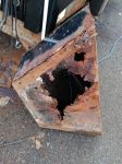 I have continued to work on this monster every spare minute I can. It has become a thorn in my side as such. Once the sides were done I was looking at the box where the pump and battery are stored. Saw a small hole and thought I should check it out to see if I have a problem. Removed the pump and battery and found this.