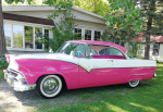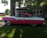 As some of you on here may recall, my wife bought a beautiful little 1954 Ford 2 door post back a few years ago, and I whined until she sold it to me, and then I went into my " Idiot Mode " a couple years later and sold the car. Since she has retired she has been doing a lot of long distance travelling with her other female church member friends, and mostly the cruise ship thing. Since this BS Covid thing, she drastically / wisely changed her mind about getting on any more cruise ships, so about 6 weeks ago, we were in the TV room and while on her computer she nonchalantly stated,... " if I could find another '54 Ford like I had, I would probably buy it !! ",... I came back with, " Well I will get right on my puter and find you one !! ",... and she agreed to it, ( and I love spending her money ), so on the puter I went, and it only took me approx. 15 minutes, and Bingo,.. ( not exactly what she wanted but a year newer ), 1955 Ford Fairlane, Victoria 2 door hardtop. Found it right in Tillsonburg, lady owned and driven,... made the call the following morning for appointment to go and look at the car, and an hour after arriving Pat owned it. Complete new interior, right through to the trunk, fresh 302 ( stock ) engine w / C-4 auto tranny, and brand new power steering unit installed. The seller gave us a journal they had of all the new parts installed into the car, and there was a ton of $$$ dumped into it. There was a bit of patina on the drivers side half of the grill and it really took away from the car, so I bought her a complete new grill through " Muscle Cars & Classics " over in Windsor, ( approx, 2 weeks coming from the US ) and I installed it for her. It's a great little car, rides as smooth as a '55 Ford can ride and drives great. I'm not a big fan of the color, but she said she can live with it, ( we both agreed that it should be " tuquois and white " , sadly, it is Tropical Rose & Snowshoe White,... given the color, I hate riding with her, as I must look like a 3rd rate Pimp with a suspended drivers license sitting in that passenger seat, and I would pay someone to steal those friggin' dummy spotlights.